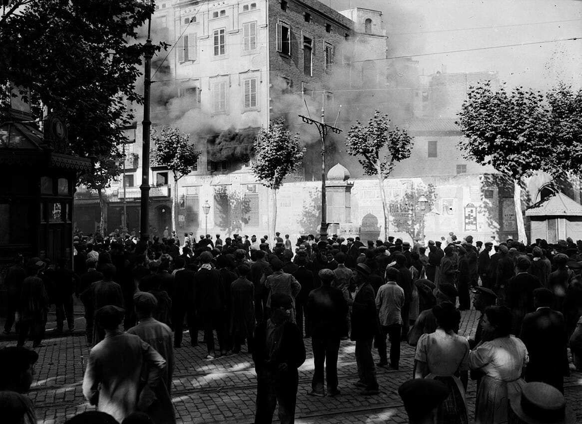 Este proceso de desgaste tuvo un punto de inflexión en la Semana Trágica de 1909. Durante esos días de violencia anticlerical, numerosos conventos e iglesias fueron incendiados, marcando una ruptura simbólica en la relación entre la ciudad y sus instituciones religiosas. Aunque la Semana Santa no desapareció en ese momento, sí quedó profundamente afectada, perdiendo visibilidad y continuidad. A partir de entonces, las procesiones dejaron de ocupar el centro de la vida urbana y comenzaron a replegarse hacia el interior de los templos, transformándose en prácticas más discretas y menos multitudinarias.