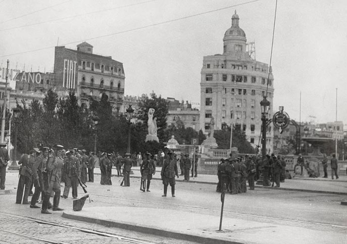 El 19 de julio de 1936, al estallar el golpe de Estado, las tropas sublevadas intentaron tomar el control de Barcelona. La Plaza Cataluña fue uno de los puntos estratégicos, y durante varias horas estuvo en manos de los militares golpistas.